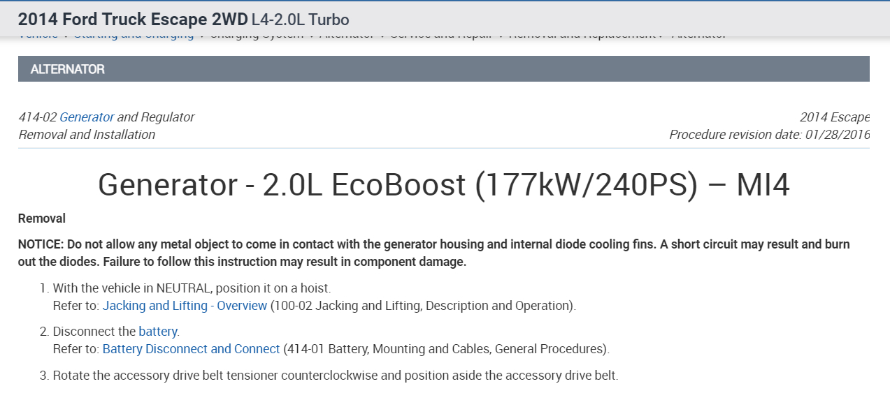 I have a friend's car that is listed above. I don't like that the battery is so hard to access. My thoughts are so you take it to a Ford dealership. But anyways. This older couple in my neighborhood has a new battery that is only a few months old. They said the car did jumpstart, but it wouldn't jumpstart last night when I tried. I'm thinking it's their alternator. It's a push start but the doesn't crank over like it's trying to send fuel so my guess is that it's something electrical. If it is draining the battery and did jumpstart with battery cables earlier, it's most likely the alternator. I watched YouTube videos and they said how much of a pain this job was. Can you please give me detailed pictures, steps and any word of caution like do I need to remove any motor mounts, A/C belt, how to get A/C belt back on, does the alternator come out more easily from the top or bottom, etc? I'm not looking forward to this job, but I want to get it done for them. Is the placement of the battery and alternator kind of like Mercedes and BMW that use design obsolescence so you have to take it to a shop, I don't know?