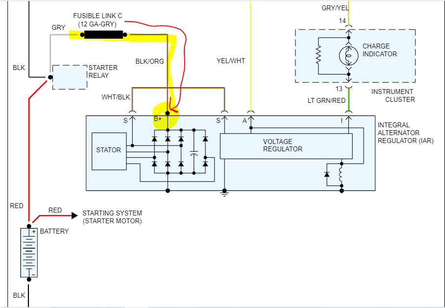 I looked at the vehicle Sunday. First, I checked the fusible link you mentioned, it was good. Next, I checked for the voltage provided through the ignition switch, it was good also. Lastly, I checked for the constant battery voltage on the yellow/white wire. None was present. I proceeded to check fuse 16 in the engine compartment fuse box. Low and behold, there was no fuse in that slot. I borrowed another fuse from the box and inserted it into slot 16. Guess what? 14.4v output. That had been the problem all along and most likely the alternator he replaced was ok. No one knows how long the fuse has been missing or what became of it. All ended well, he is riding and happy.