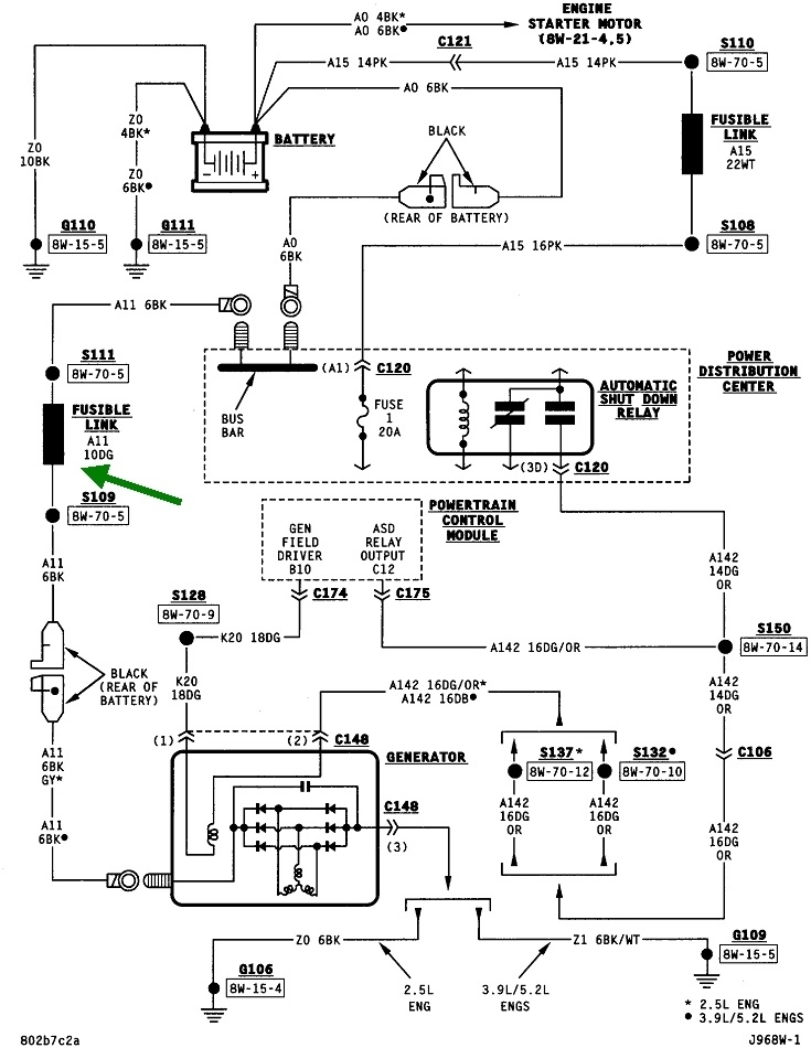 In the fourth photo, you found the fuse link wire. It's common to hide them away as you don't have to access them very often. On the older front-wheel-drive cars from the mid '80s to mid '90s, you'll find a whole bunch of fuse link wires wrapped together in a bundle going around the left front strut tower. The two orange arrows are pointing to the moisture-proof heat-shrink tubing used at the factory. The green arrow is pointing to the fuse link wire itself.