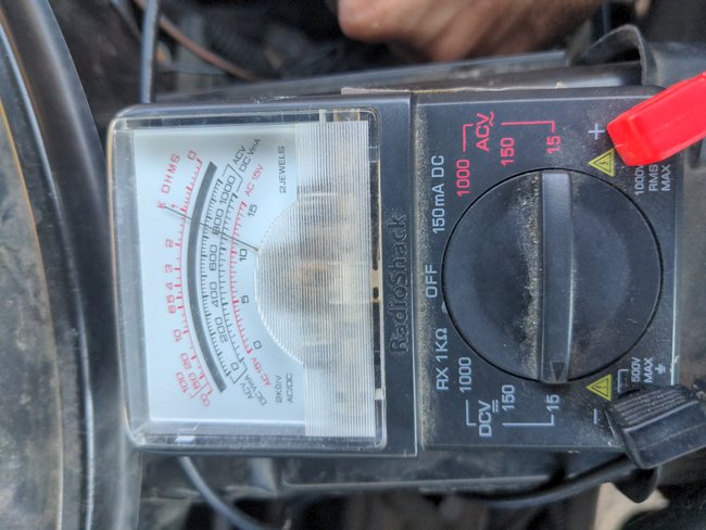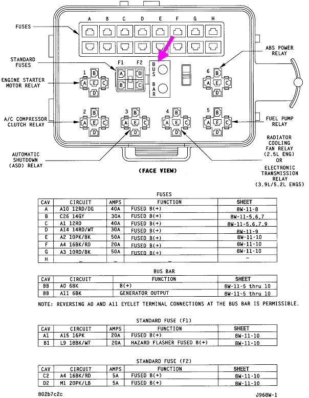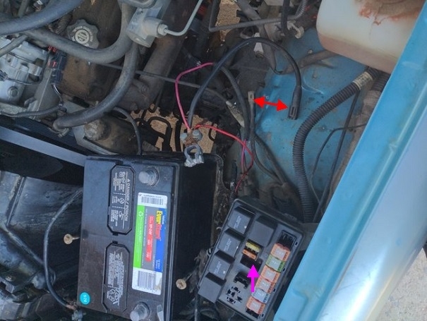 First of all, I see the reason for some confusion. The first drawing is of your Power Distribution Center, (PDC), under the hood. I had expected to see the two buss bar studs in one corner, sticking out from the box. In fact, yours are tucked away in the middle, as shown with my purple arrow. You should be able to reach down in there and measure 12 volts on both studs all the time. For your current problem, I suspect you'll find 0 volts.