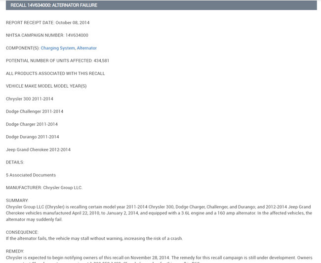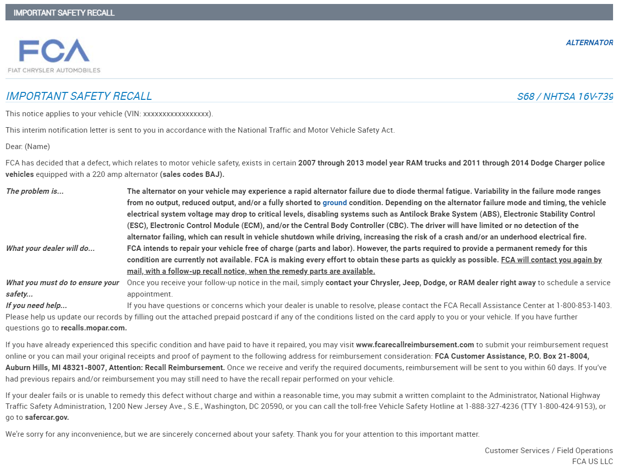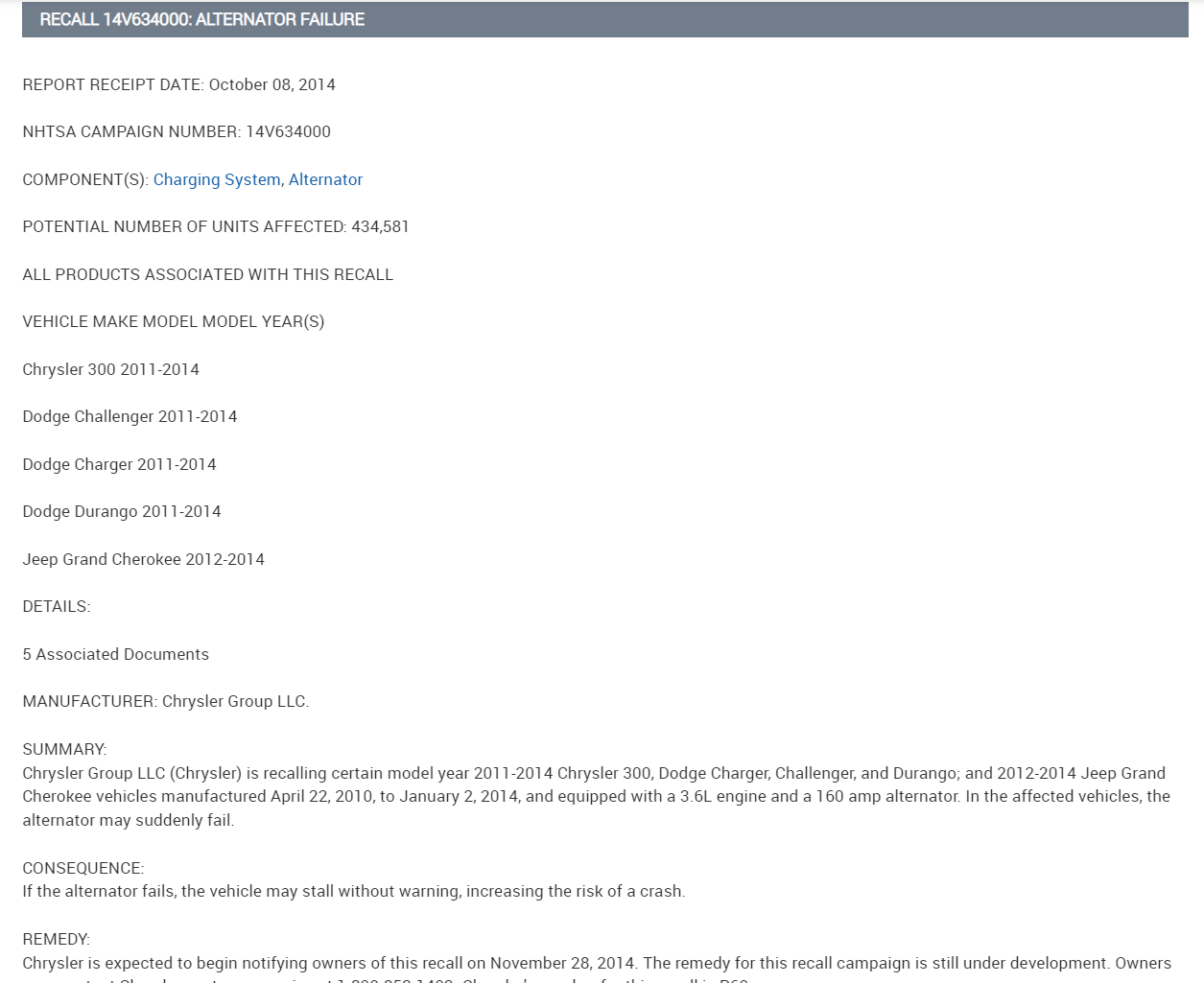 See if you can find a part number on the Alternator case. If the Battery light is on and its being drained your alternator is either not charging or the PCM is not commanding it to charge, having a basic multimeter to check the voltage at the battery at idle, at 2500 rpm, and then the battery rest voltage with the vehicle off would tell us a lot. I don't see how the shop let a vehicle go in that condition. The battery voltage really should be checked during cranking, so it has a max load on it. I don't see specific sub models here in all the recalls, but this is half a million vehicles with these faulty diode trio's that are failing due to thermal issues. It's not just Dodge Charger's with these Alternators. It's a Chrysler 300, Durango's, Jeep Grand Cherokee, Challenger's. So obviously there's a major issue here. If that shop has your vehicle for 2 months and couldn't figure out what was wrong with it, that's a red flag to me. The PCM was replaced, who knows how many Alternators the shop tried. I would get a basic multimeter and while the vehicle is idling in the driveway, start doing some voltage drop testing from the engine block, body(frame), Alternator case to Battery Negative and see what the voltage drop is on those Ground sides. If the PCM detects any faults in the Alternators field control which is used to control the charging voltage level, it will set codes for the charging system. There are only 3 wires on this alternator, the wire to the battery, the Gen Sense wire which is where it monitors the PCM monitors the output and the Gen Field Control. The shop should have checked these wires for open circuits or shorts to ground.