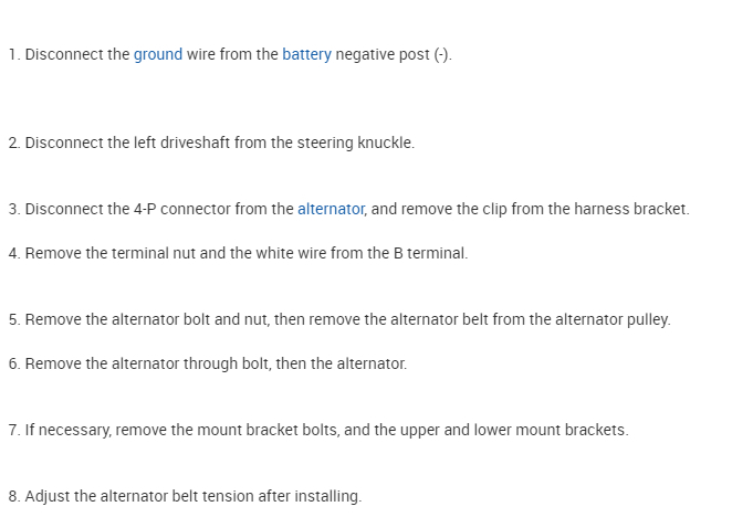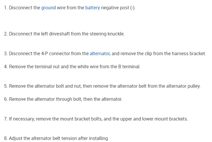 Pics one through three are the directions for the removal and replacement of the alternator. Make sure before you start the procedure to disconnect the battery.