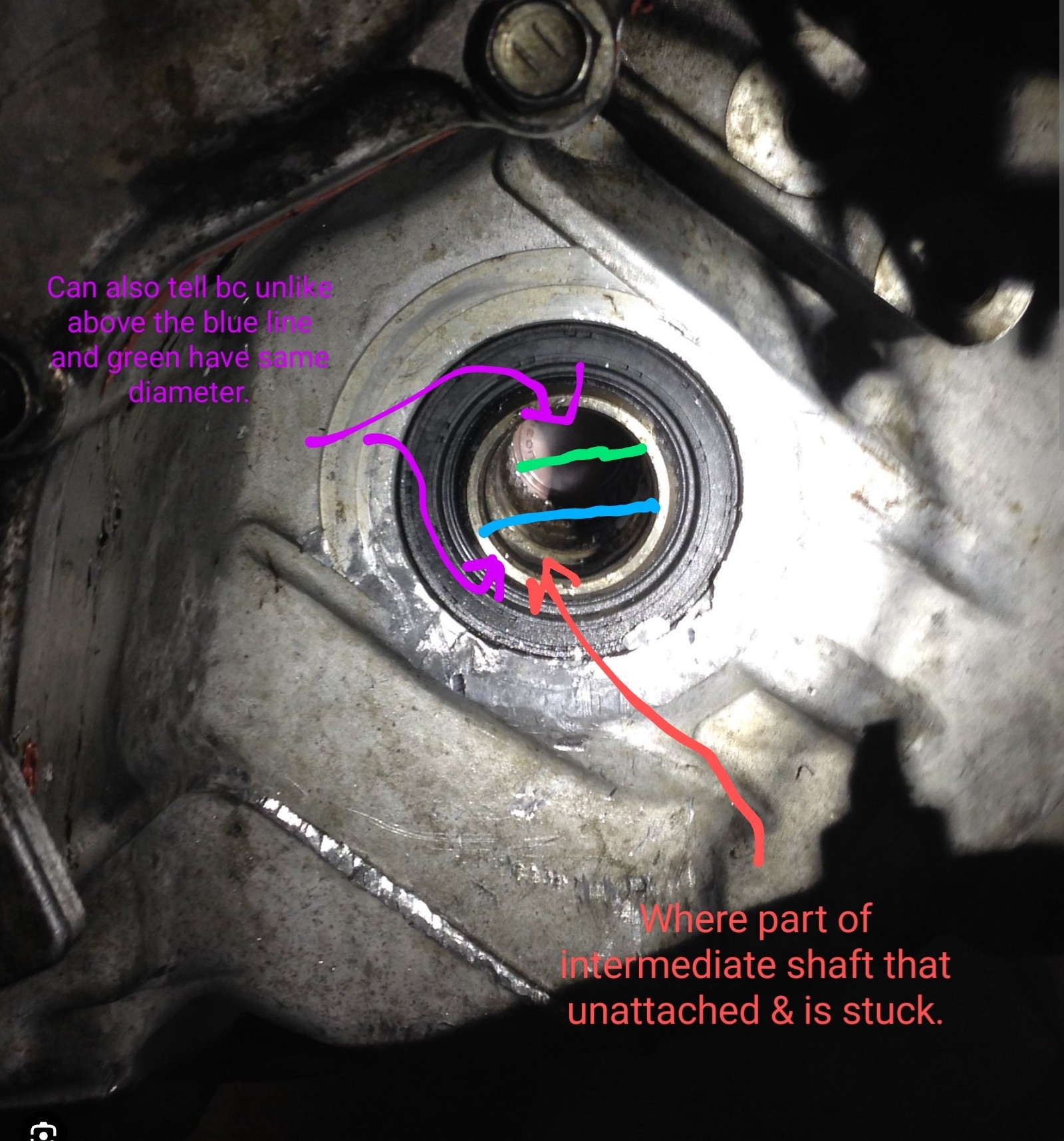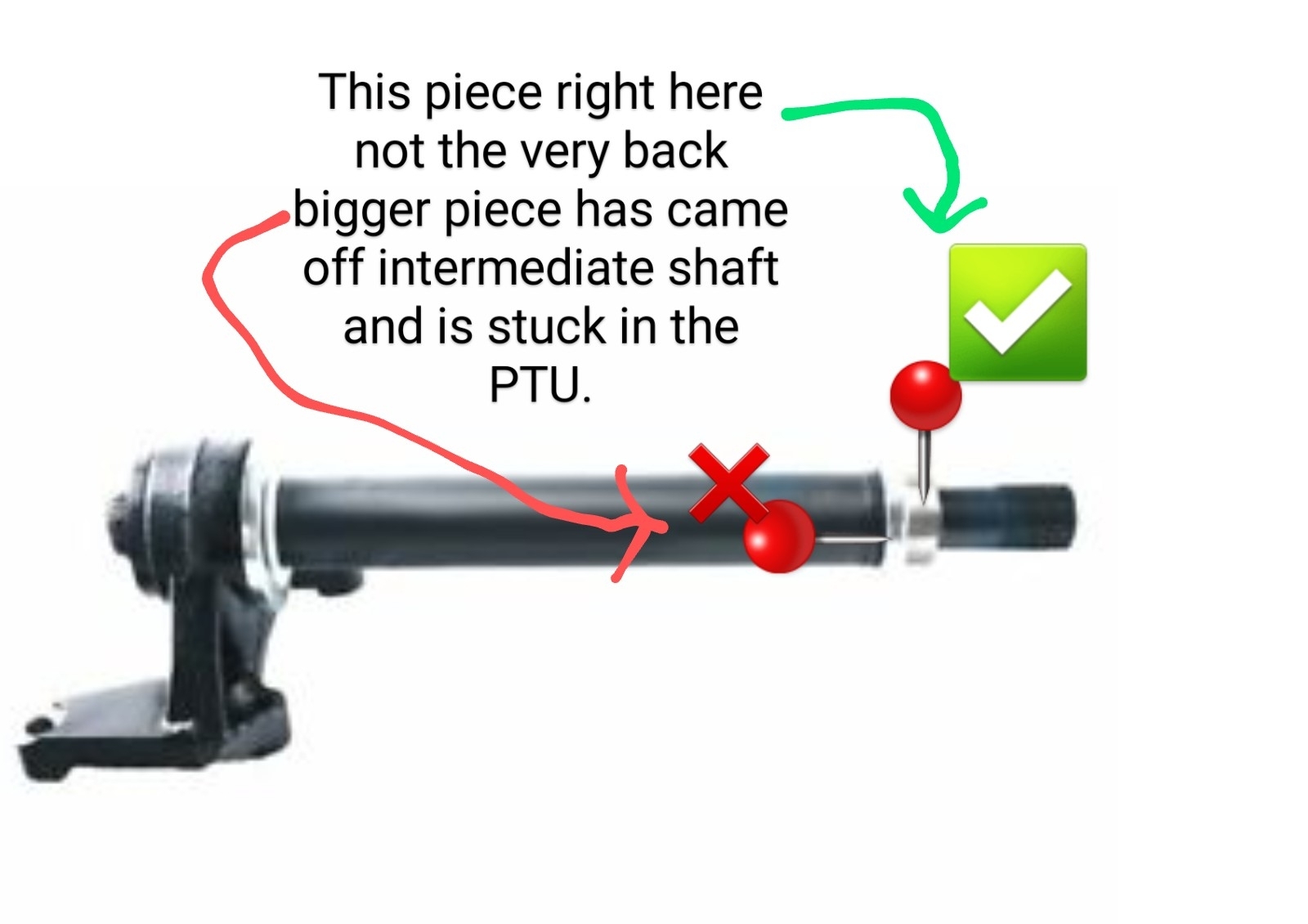 I removed my old CV Intermediate shaft and went to replace it with a new one when I noticed it wouldn't go in all the way. After a day of investigating why I noticed the old Intermediate shaft was missing a part and it was stuck in PTU. I've pulled some pictures of the line to save me from crawling under the car at 4:30 AM. I've tried about every possible method (slide hammer, bearing pullers, homemade rigs, etc, ) to remove ring from PTU with no luck. It's in so tight there's nothing to grab onto front, middle or back. Local O'Reilly, AutoZone or anybody I know have never encountered or heard of that happening. Appreciate any advice, Thank you.