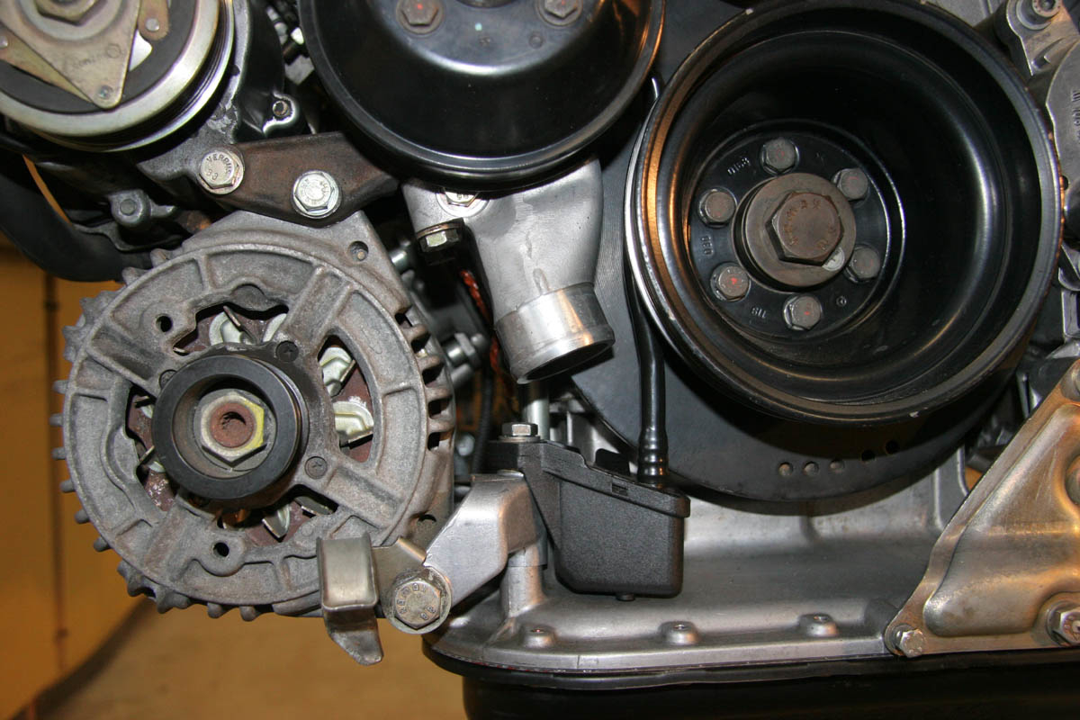 Anti freeze leak in small plastic box connected to pump by a thin rubber hose. The small plastic box is located under the pump, near the alternator.