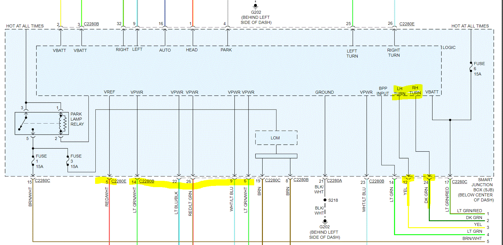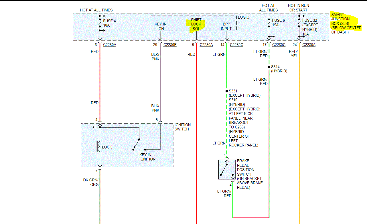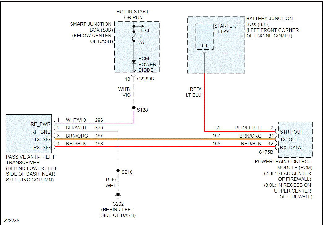 The passive anti-theft system (PATS) transceiver receives voltage from the smart junction box (SJB) fuse 5 (2A) on circuit 296 (WH/VT) and is grounded on circuit 570 (BK/WH). The PATS transceiver and the powertrain control module (PCM) communicate on circuits 167 (BN/OG) and 168 (RD/BK). The PCM compares the key code stored in memory and enables the starter if the key code is correct.