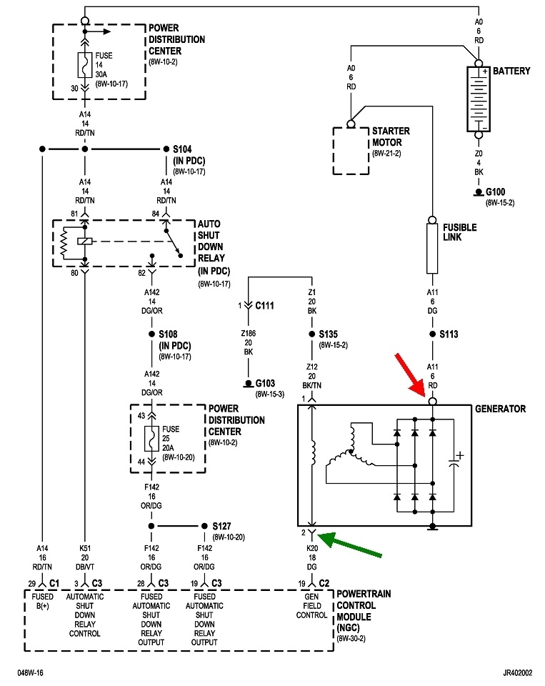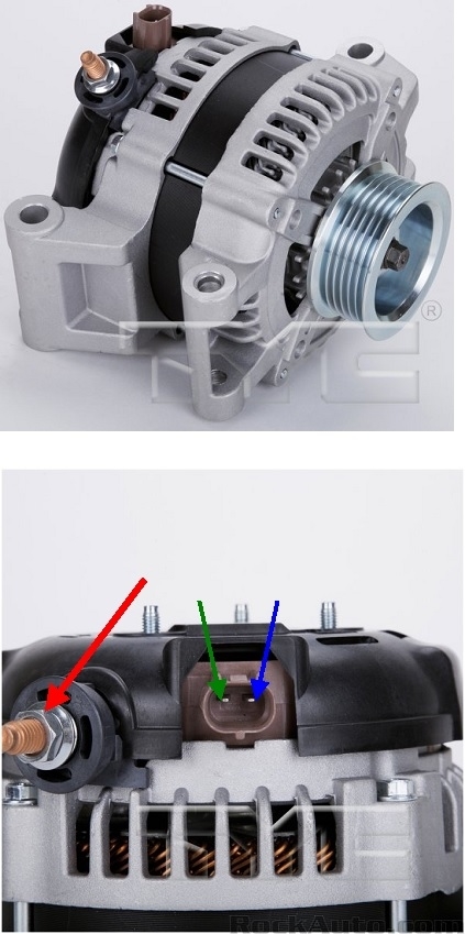 Connect its clip lead to the battery's negative post or any paint-free point on the engine or body sheet metal. Now touch the probe to the large stud on the back of the alternator, (red arrow in the second photo). You must find full battery voltage on that stud. It will be 12.6 volts if the battery is good and fully charged. Even if the battery is discharged, you can expect to find 12.2 volts. Either way, the test light will be full brightness. If you find 0 volts, double-check the ground clip for the test light. If you still find 0 volts, we have to look at the fusible link. If that is blown, it was likely due to the old alternator being shorted, even though that is rather rare.