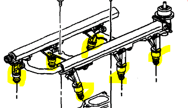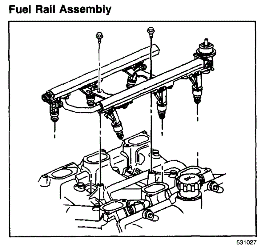 If the injectors seem good, next do a quick inspection of the fuel rail itself to make sure nothing is cracked or damaged (unlikely).