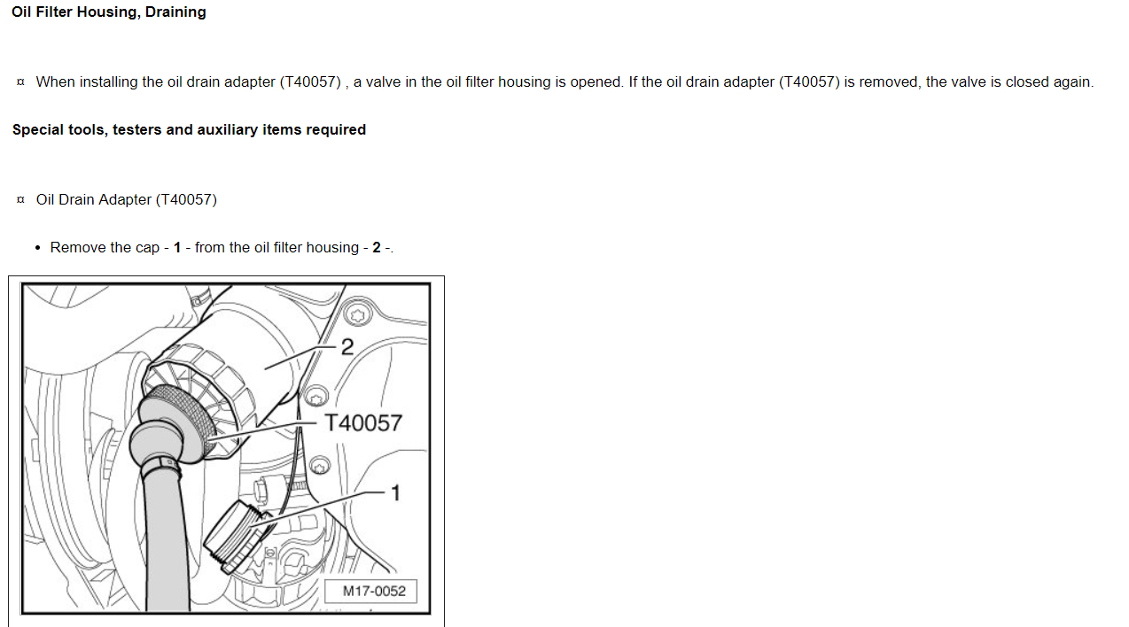 When installing the oil drain adapter (T40057) , a valve in the oil filter housing is opened. If the oil drain adapter (T40057) is removed, the valve is closed again.