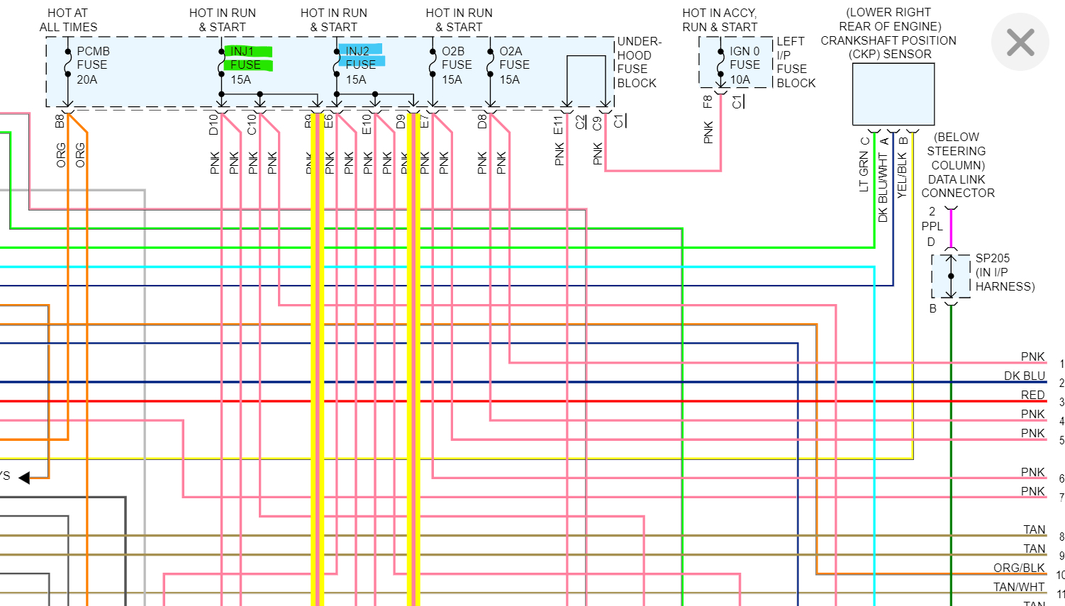 With the coils unplugged and the key in just the on position, engine off, you should have 12 volts on the pink wire for each coil on Bank 1, and you can use the black wire as your Ground to check the power, let's start there. On the second diagram the INJ1 Fuse 15amp is the fuse for the Bank 1 coils and a bunch of other components. So, I don't think you have an issue there. But check for 12-volts first and Ground. If you don't read 12-volts trying using the battery negative for your Ground location. If there are still no 12-volts, switch it around, go from the battery positive to the Black coil wire to verify there is a Ground connection at the Coils. Let's find out everything that you are missing here.