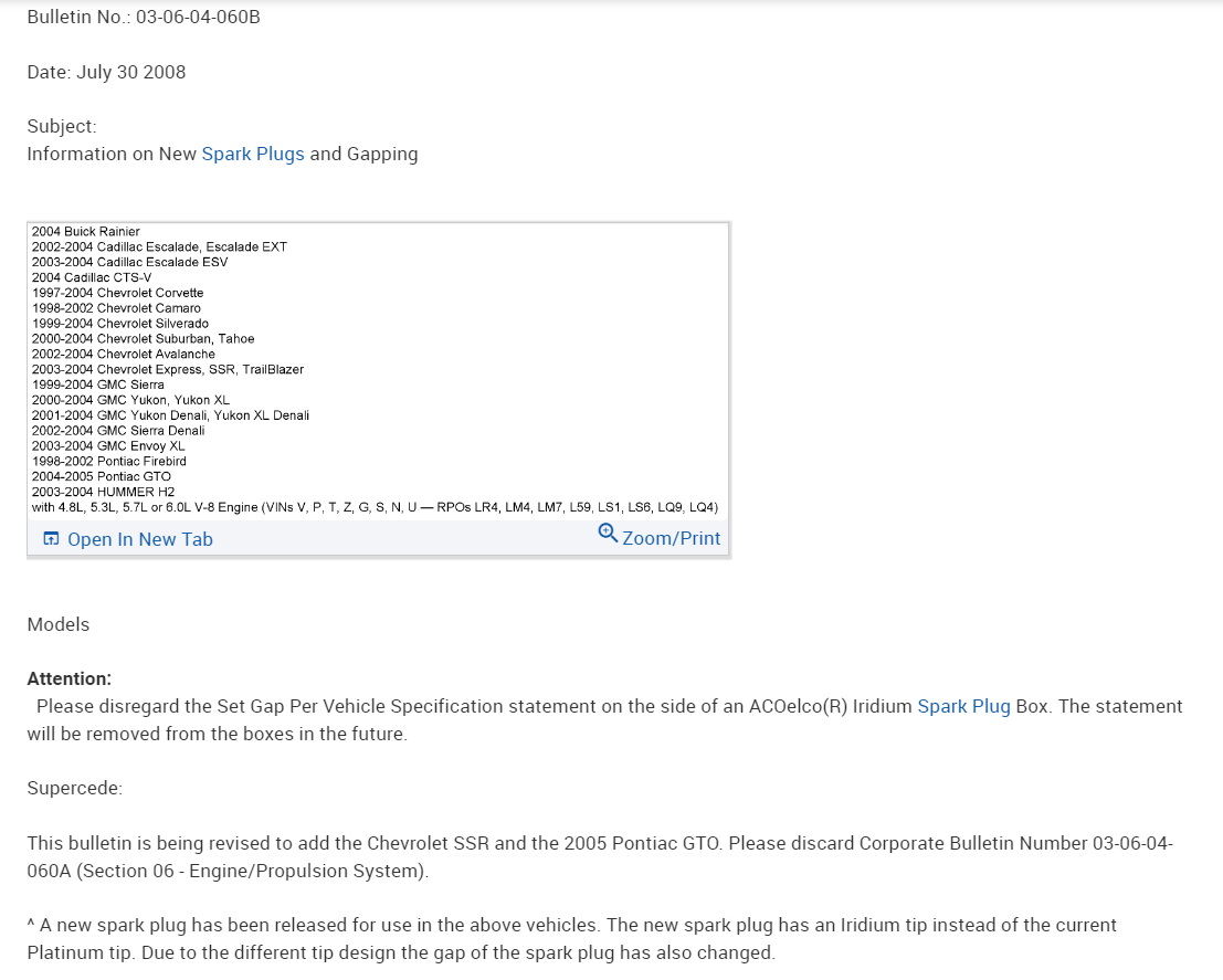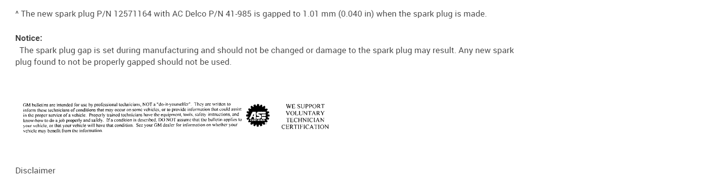 There is also a Technical Service Bulletin on the Spark Plug Gap, (pages 5 and 6) since you're dealing with the Ignition System.