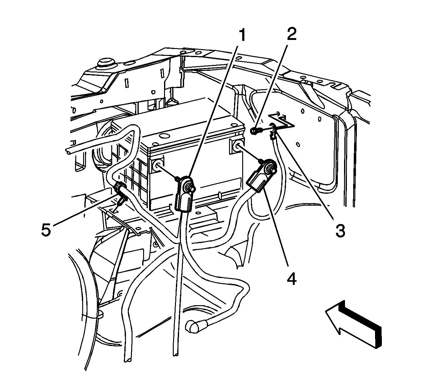 13. Install the positive battery cable clip (5) to the battery tray.