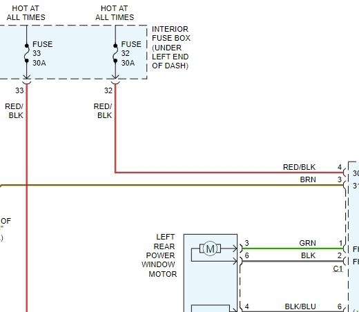 First, every schematic I found shows power to the trunk, mirrors, and windows on separate circuits. See picture 5 for fuse 7 allocation that I have. Powers back up relay.