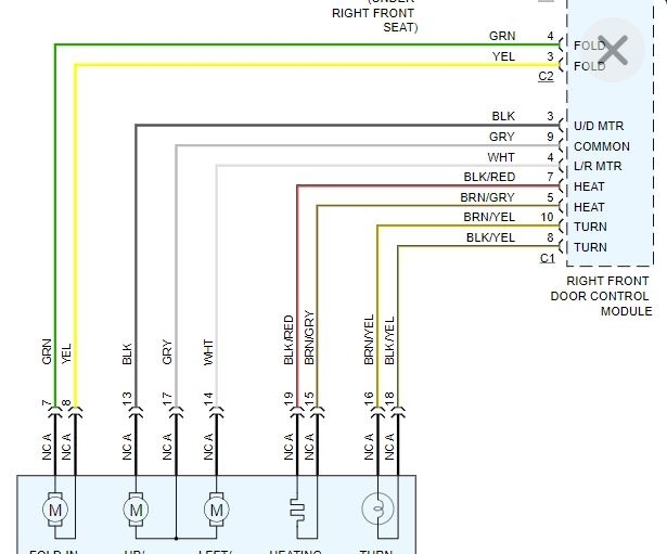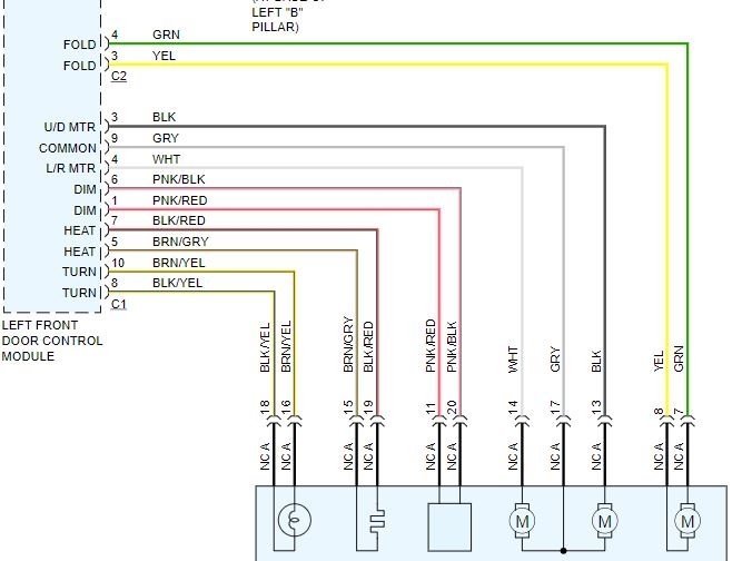 As far as the fold in mirrors and power to the mirrors, fuse 21 powers the left and 22 powers the right. The fuses are under the left side of the dash. Power is supplied to the left front door control module and the right door module. See pictures 6 and 7.