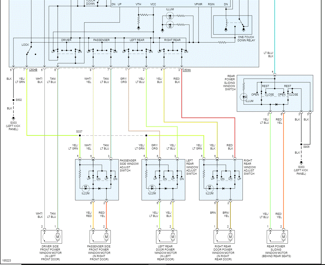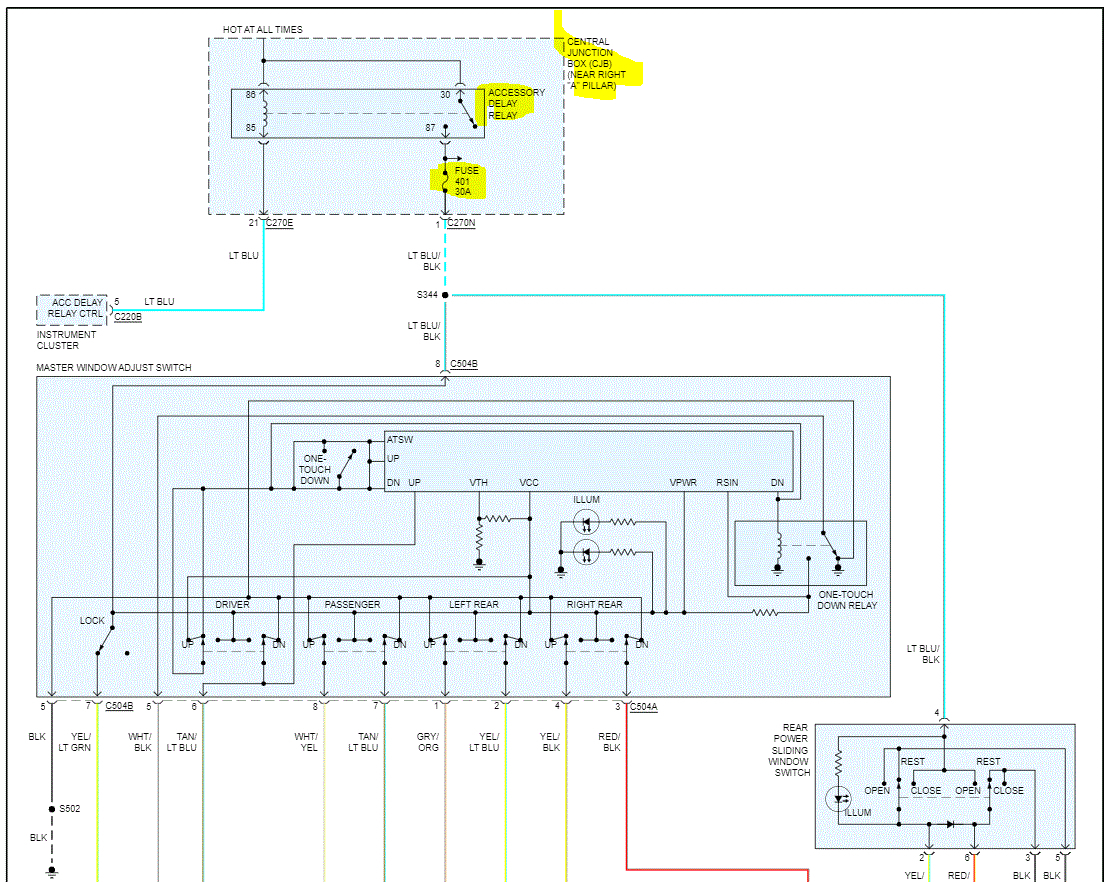 First, I attached the wiring schematic below for you to review. Interestingly, there is power at all times available to the windows. However, for them to work, the accessory delay relay needs to be actuated. When that happens, power is sent to the main driver's door switch. From the switch, power is sent to the window motors.