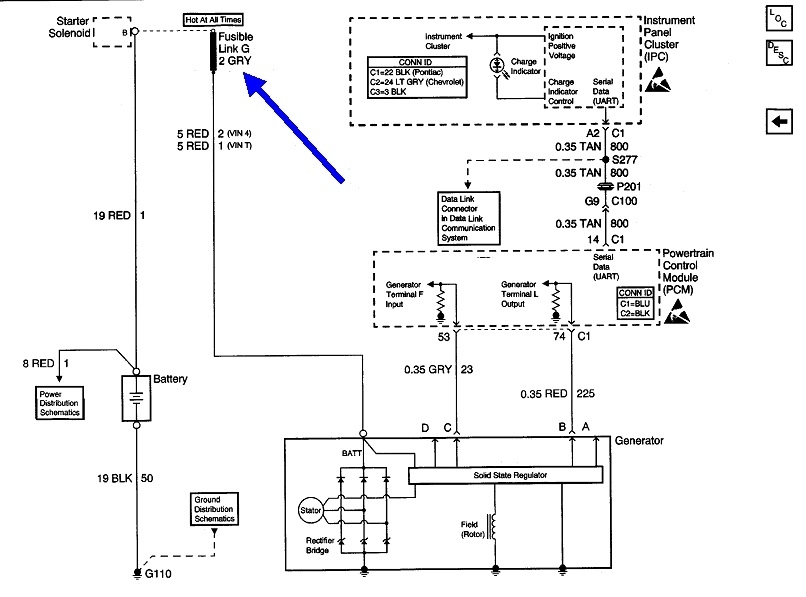 This first diagram shows the charging system with the blue arrow pointing to the fuse link wire. The second diagram is for the starting system. That blue arrow shows where the fuse link wire taps off from the battery cable.