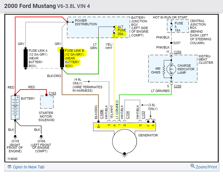 Next, I attached the charging system wiring system. Check the fuses to confirm they are clean and tight. Additionally, the black wire with an orange tracer should have battery voltage at all times. Check it. While checking it, wiggle the wire to make sure the voltage doesn't change. This would be a good suspect due to the fusible link. The connection may be starting to fail.