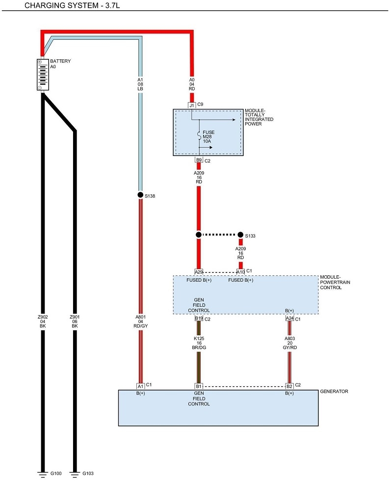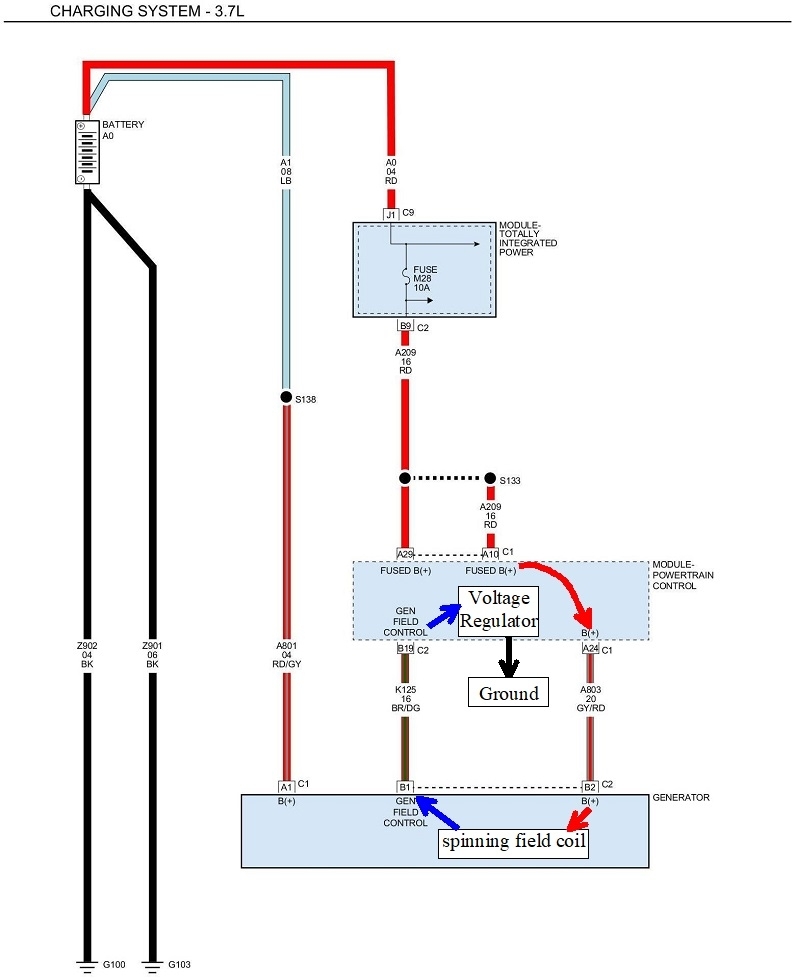 It looks to me like they're still using the older, easy-to-diagnose-circuit. The first diagram is the aftermarket version of the charging system, but to help explain it, they left out a few details. I added them in the second diagram. In older models, the 12 volt supply was switched on through the automatic shutdown (ASD) relay that also powered up the injectors and ignition coil(s). Here they show it coming directly from fuse M28 in the under-hood fuse box. I'd like you to tell me if you have that 12 volts on the back of the alternator all the time, just when the ignition switch is in "run", or only when the engine is running. On older models it was just when the engine was running. We'll get to that shortly.