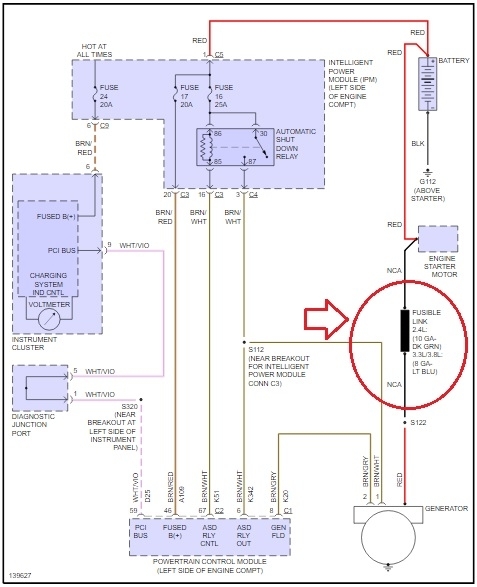 Next measure the battery voltage at the terminals themselves. As yours is not charging and it has a draw you may end up needing a new battery first. However for testing, if it will start, use the voltmeter with the engine running, test the voltage at the battery. Next with one lead of the meter grounded go to the alternator and test the output on the battery output post (large red wire). If you see over 13-14 volts at that post but not at the battery you have a break or corrosion in that wire and the voltage is not getting through. That could be a burnt fusible link or a simple broken wire.