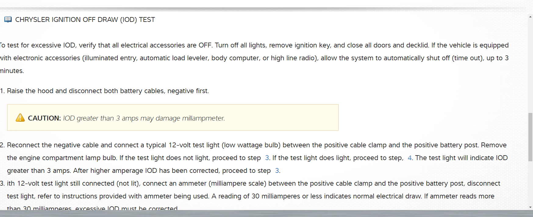 You're doing the drain test the wrong way. That test light trick worked years ago before the insane engineers put all the computers on the car, but no more. Today, with all the memory circuits in the multiple computers, the industry standard is a maximum of 35 milliamps. Chrysler says at that rate, a good, fully-charged battery will still be able to crank an engine fast enough to start after sitting for three weeks. Test lights need a lot more current than that to glow, so you could have an excessive current drain and never see it in the test light.