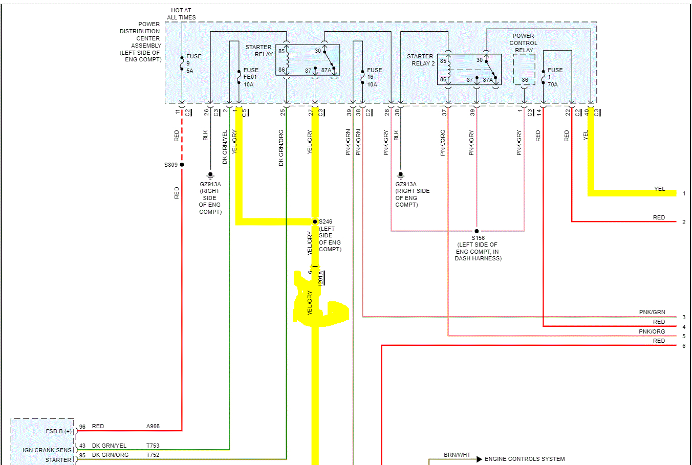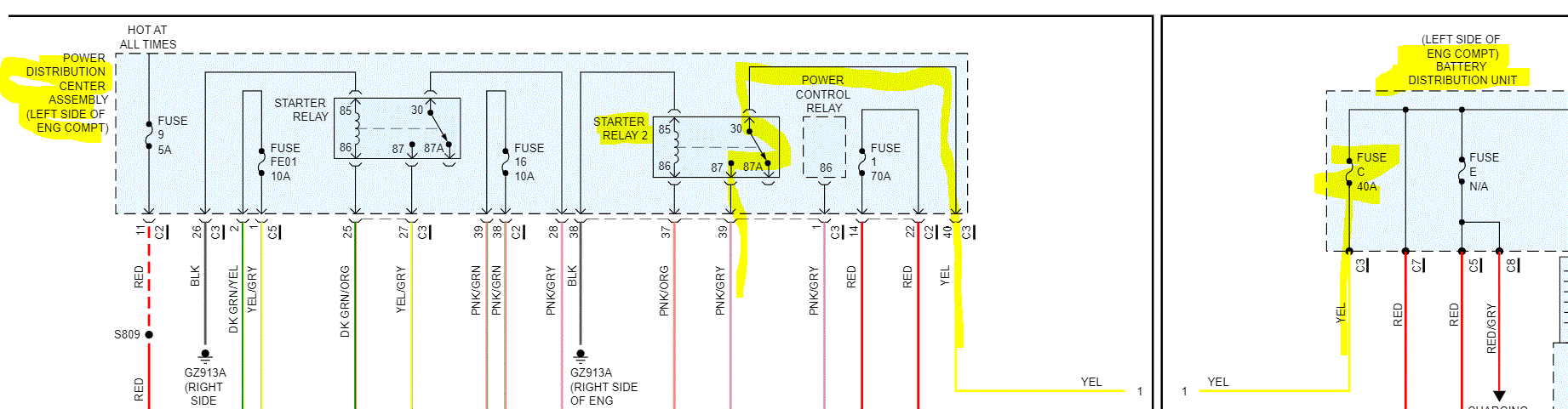 Also, I attached one of your pics below. I pointed and circled in two places which I believe are yellow with a gray tracer. That is what goes from relay 1 to the starter. I have arrows pointing to others. Are any of those a solid yellow wire?