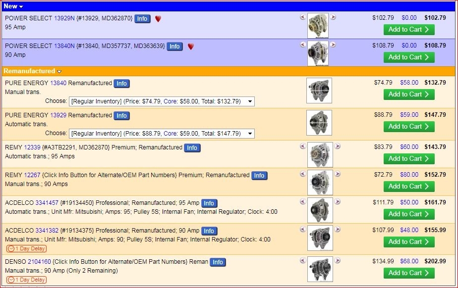 Keep in mind some of these are going to be rebuilt or reman units. That does not mean used. They have been taken apart and have new parts inside of them. However, they carry a core charge which means they are going to be more expensive until you return the old unit off the car and then they will give you money back.