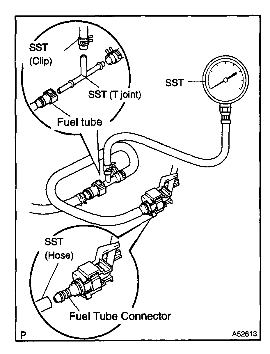 e. Install SST (pressure gauge) as shown in the illustration by using SST and fuel tube connector.