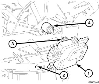 4. Remove the two screws (4) that secure the blend door actuator to the air distribution housing and remove the actuator.