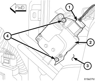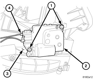2. Install the two screws (4) that secure the blend door actuator to the air distribution housing. Tighten the screws to 2 Nm (17 in. lbs.).