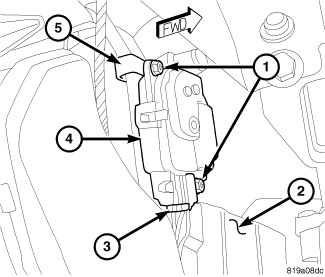 1. Position the mode door actuator (4) onto the bracket (5) located on the right side of the HVAC air distribution housing (2). If necessary, rotate the actuator slightly to align the splines on the actuator output shaft with those in the mode air door linkage.