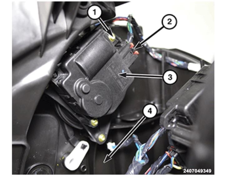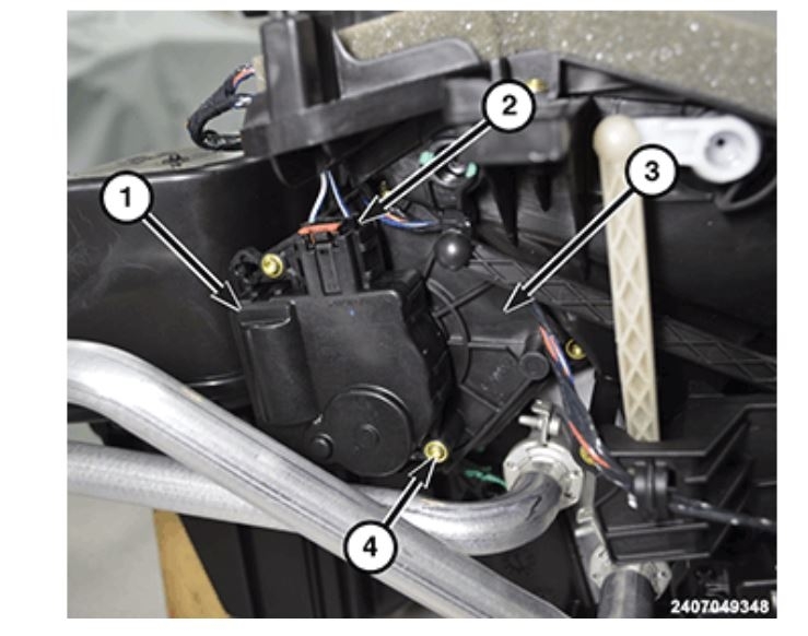 Remove the two screws (1) that secure the blend door actuator (3) to the right side of the HVAC air distribution housing (4).
