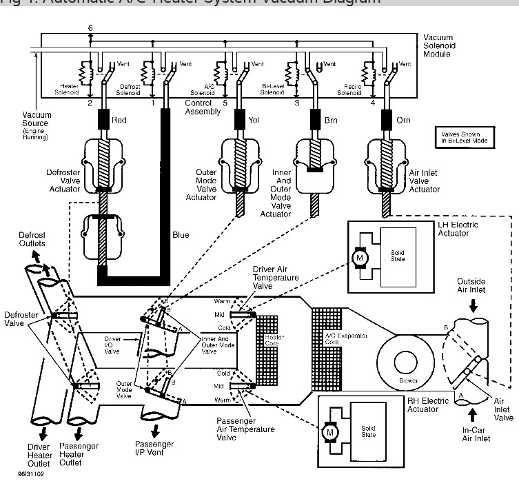My car has dual climate control and it dose not matter what vent selection I put it on it always blows out all of the vents. The heater does not heat and the air conditioner never gets cold on either side of the car. Is this a vacuum problem or a blend door or am I missing something entirely? Any and all help is as always greatly appreciated.