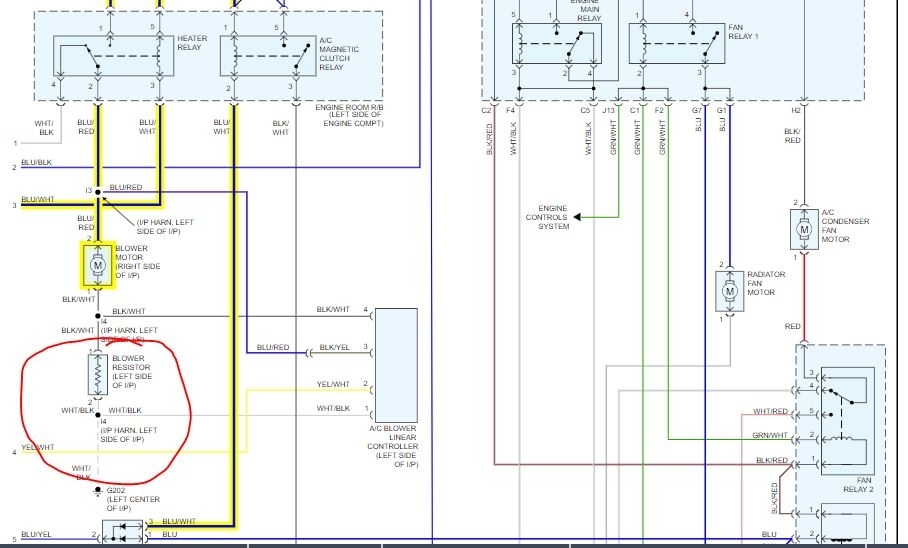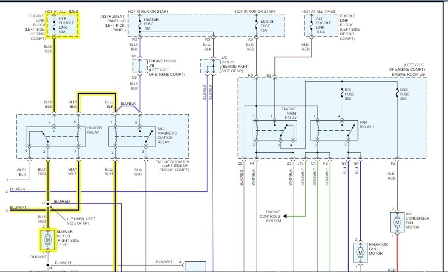 Okay, I attached the wiring diagram for you of the blower motor. You need to verify power to the motor with the key in the on position. There should be power there. After the motor will be the resistor that varies the speeds depending on demand.