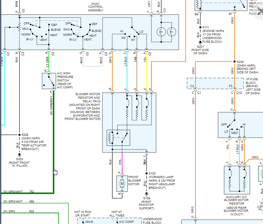 I am attaching the info on this. I assume you are correct that the relay is most likely the issue. The way this works is when you put the switch to high it closes the relay and sends battery voltage directly to the motor which is the high setting. All other settings the relay is open and the voltage passes through 1, 2, or 3 resistors depending on how fast it needs to spin.