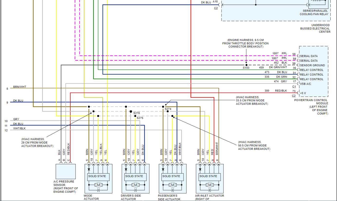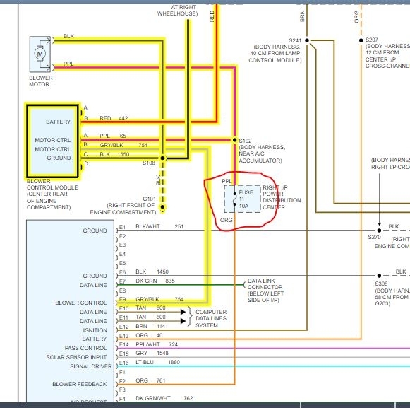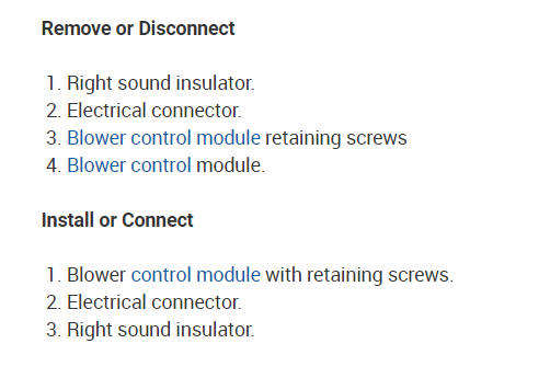 The diagrams are quite different from the factory manual drawings. The module has 4 terminals: hot power, ground, input signal, and output voltage. I have checked those things. My concern is the input signal from the HVAC programmer. With the module disconnected, the signal reads 8.2 volts instead of a variable voltage as the speed button is changed. If that were true it shows the programmer is at fault. But all the door functions work normally, except blower fan. I guess my next step is to back probe the input signal when the module is connected. The symptoms indicate a bad module, but only if the input signal checks okay. My module is ACDelco 15-8684.