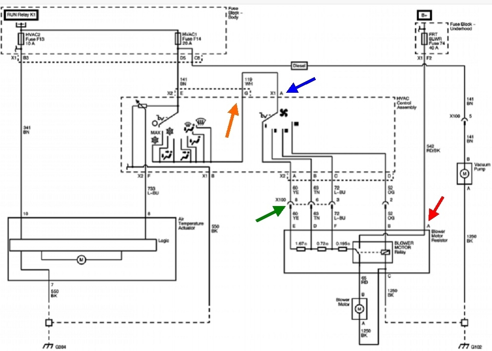 Since you already have gained access to the resistor, lets start there. Verify it's that red wire where you found 12 volts. If it is, that one can be disregarded. It's the three by the green arrow we're interested in. Switch the speed switch to any of the lower three speeds. As long as that three-wire connector, X100, is plugged in, you should find some voltage on all three wires. They're yellow, tan, and light blue wires. The voltage comes in on the wire that's switched on, and feeds through different parts of the resistor, then shows up on the other two wires. We don't care if the voltages are a little different, just whether they're there or not. If you do find voltage there, you should have it on one motor wire too. If it's there, the motor has to have a bad ground connection. That isn't likely because you said there is no voltage to the motor.