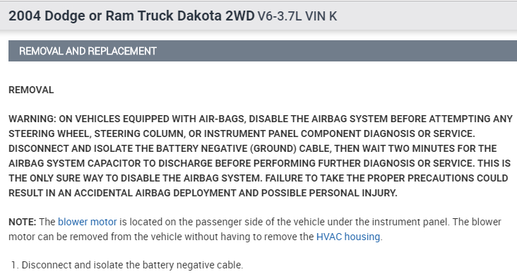 1D7GL42K94S697003 is the VIN#. I'm looking to buy this truck from a dealership for $3,000.00 here in Tennessee. I haven't driven the vehicle or never seen it in person, but the fella told me that the only thing it is needing is a blower motor for the AC/heater. The blower motor is around $100.00. My question to whomever is, how big of a job is this? I'm not a master mechanic but I know a little bit. The motor is supposedly under the passenger side dash. I'd also like to know is, will I have to tamper with the airbag components or is this a pretty easy job to replace the blower motor?