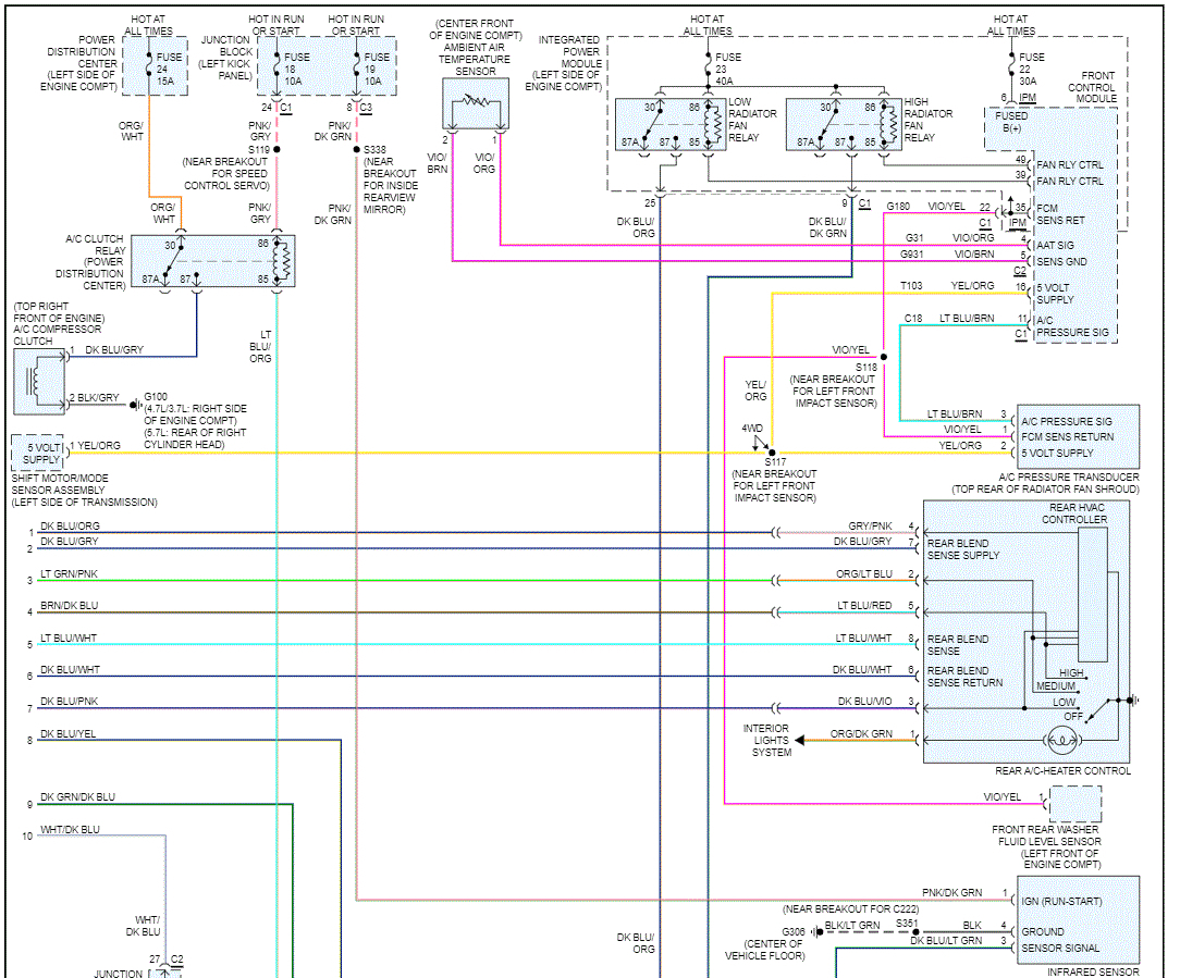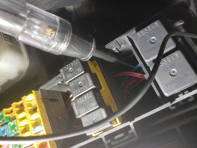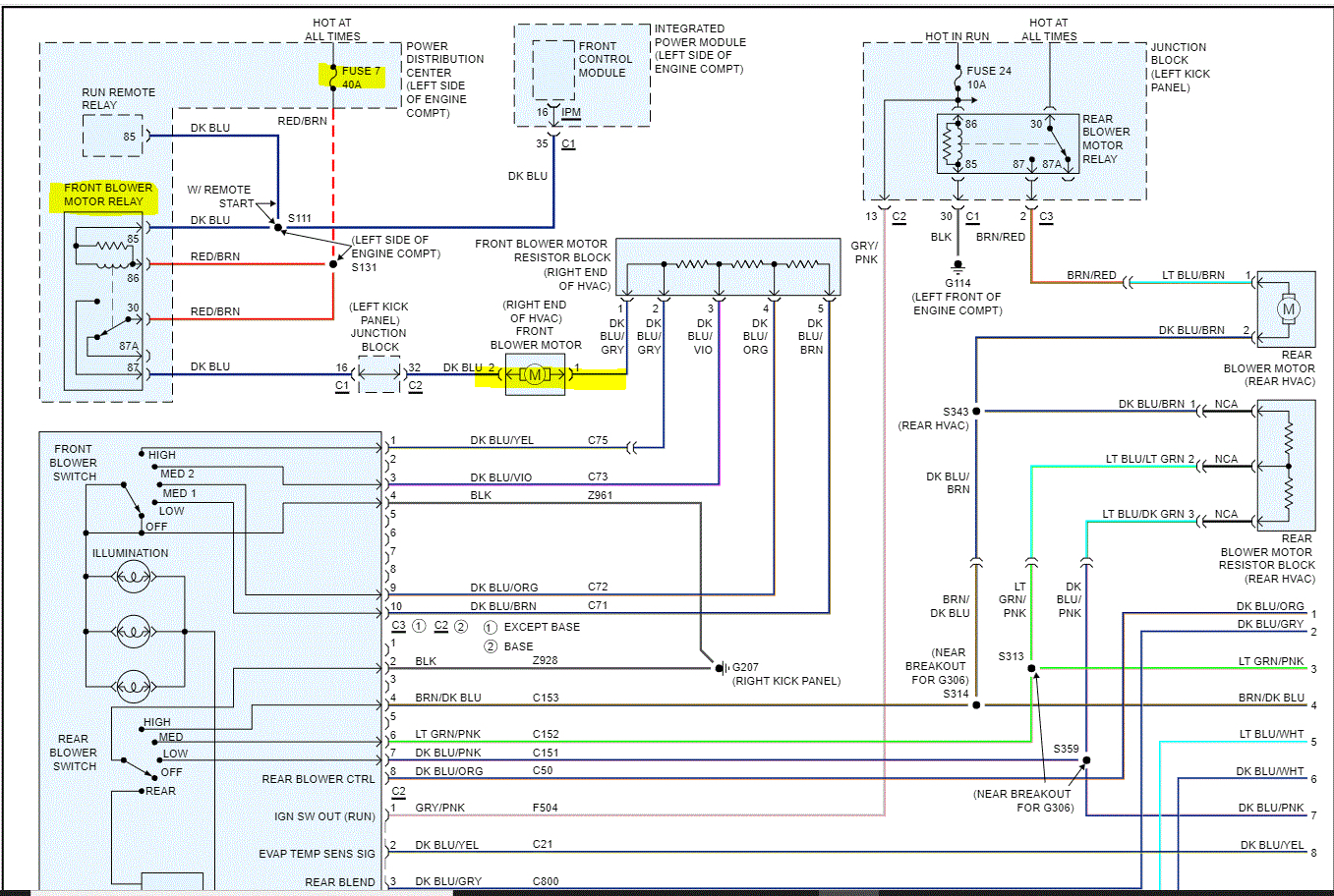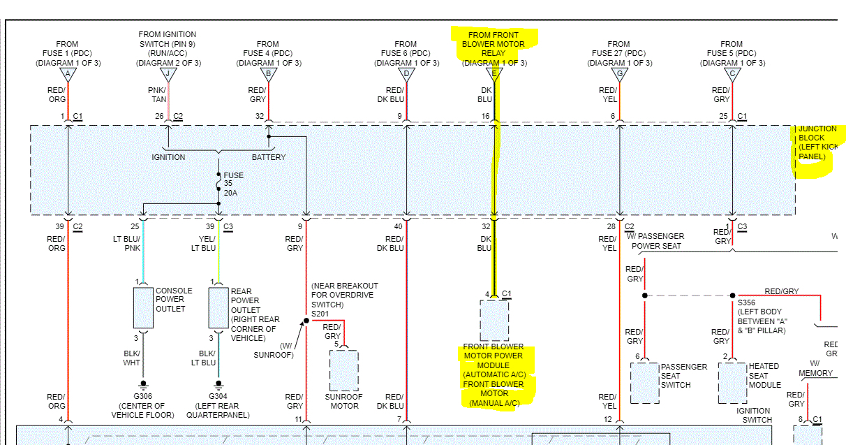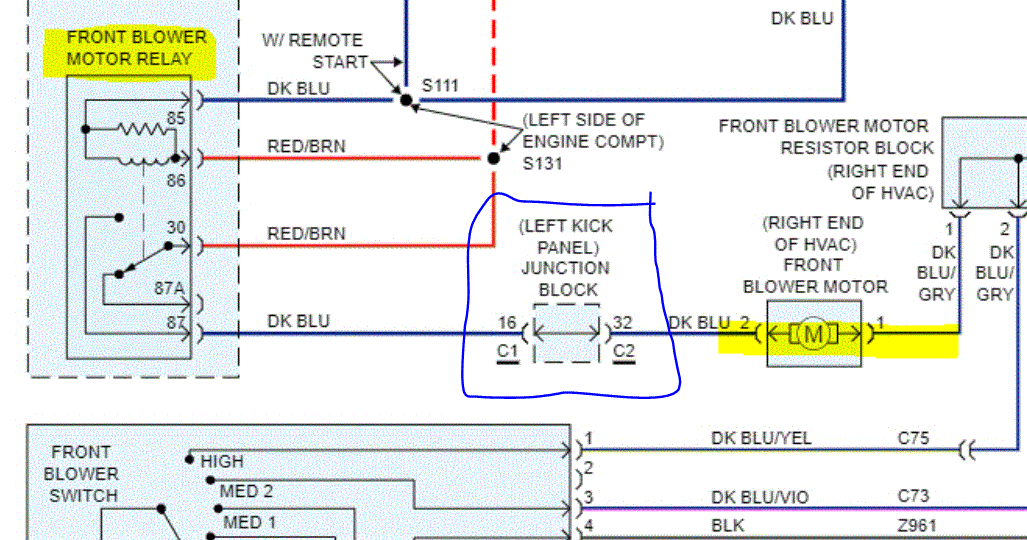 You mentioned there is no power at the blower motor when this happens. If you look below, I circled a connector at the left kick panel fuse box where power from the relay jumps from one connector to another. I need you to locate the dark blue wire that powers the blower motor and trace it to that connector. Check both sides of the connector/wire for power. Or locate the dark blue wire at the relay and see if power is present. Since you have already checked power at the fuse and relay and it was good, I have a feeling you will find the dark blue wire is not making contact at the connectors/fuse box. Chances are at that point, there is either corrosion, a loose contact, or one of the pins has been damaged.