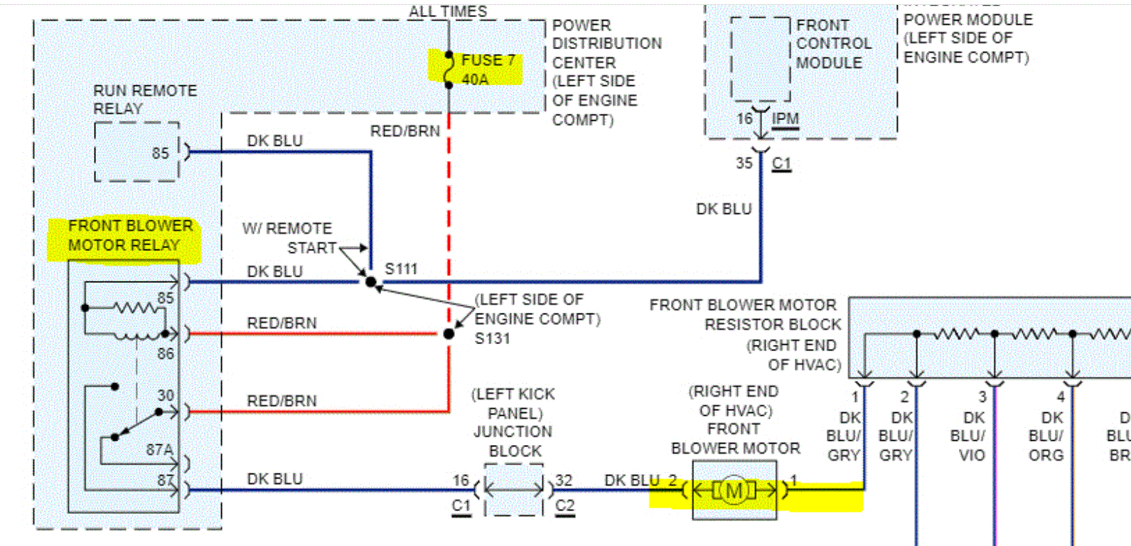 The power runs from the fuse to the relay, to the blower motor, then the resister, then the control switch, which provides a ground path, completing the circuit. We need to determine where it is lost when not working.