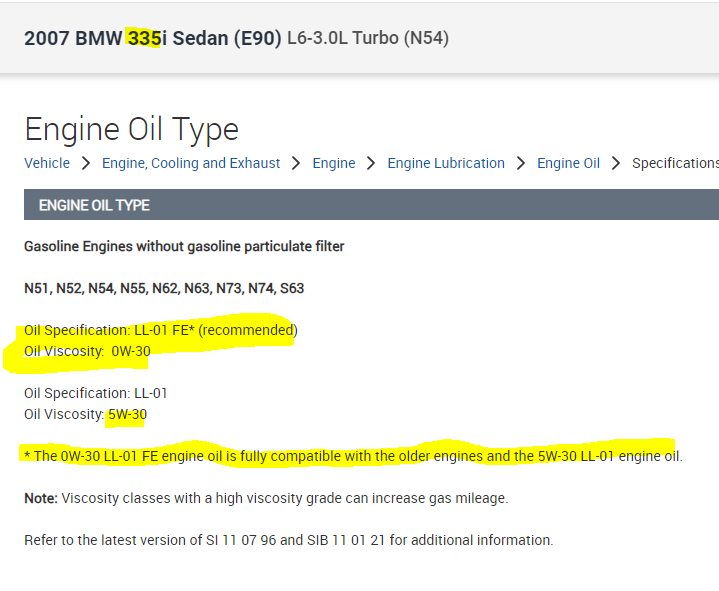 According to the manual, the recommended oil for the 335 is 0W30. However, 5w30 is acceptable. See pic below.