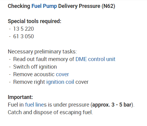 How much fuel pressure should build up on the fuel line when you turn the switch on for a 3.0i engine in a bmw x5 2005