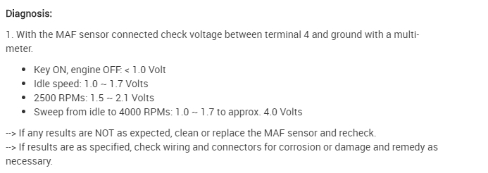 I did attached a quick voltage check for the MAF. So if you want to check the voltage first that would be how to do it and what you should be seeing.