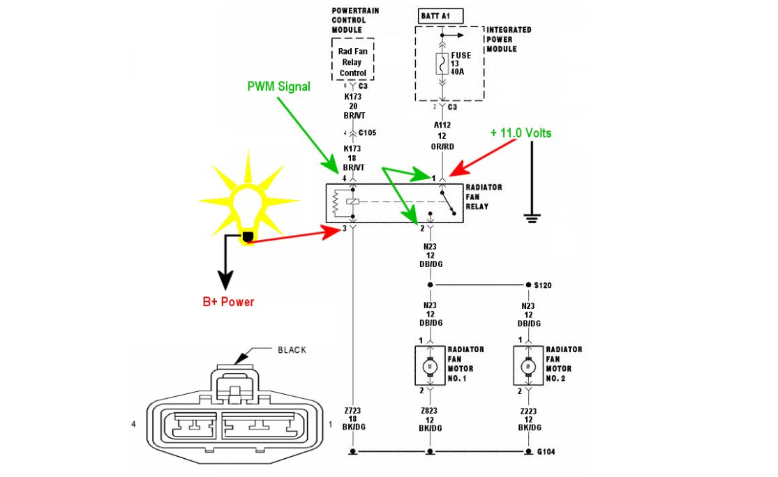 --> If the voltage is NOT above 11.0 volts, inspect the Radiator Fan fuse located in the Integrated Power Module (IPM) and/or Repair the (A112) Fused B+ circuit and retest.