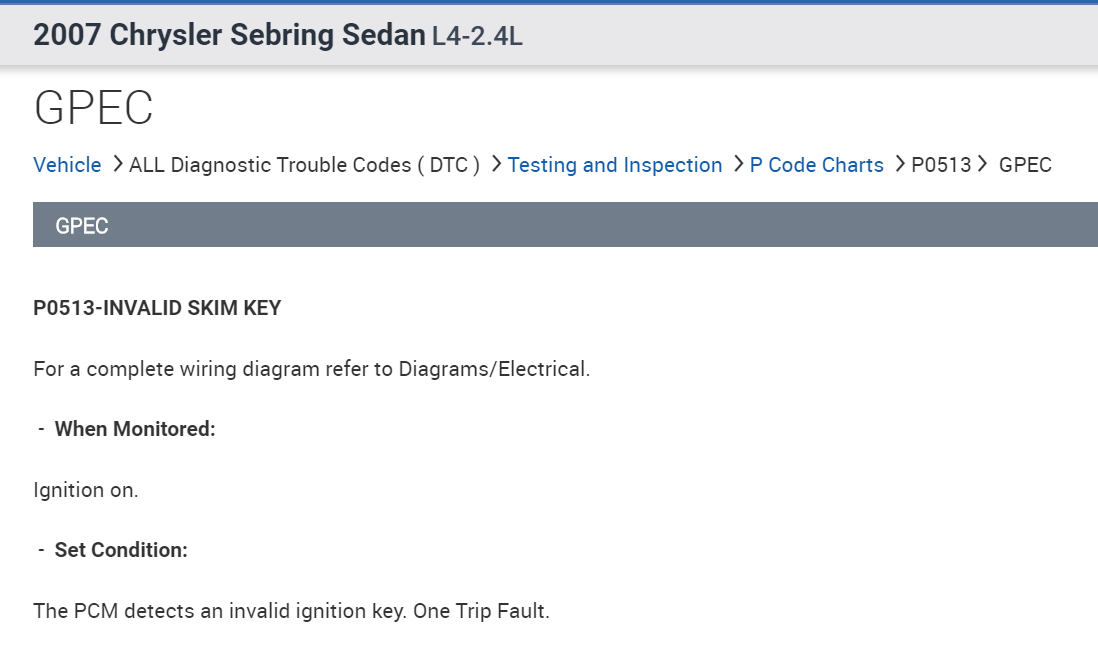 I have included the descriptions and probable causes for the Direct Trouble Codes (DTC) you sent in the diagrams below. The only one that would really concern me is P0513. How well do you know the person you bought the car from? This DTC is for an unprogrammed key. I am not saying the car is stolen, but we just don't want to get in any trouble. Having said that, we also have step by step instructions for tracking down and fixing all these DTC's, and can give them to you on request. Let us know.