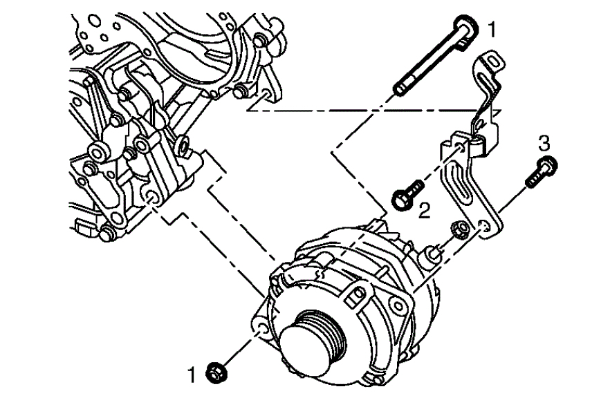 Temporarily tighten all of alternator bolt and nuts. And then tighten them in numerical order shown in the figure.