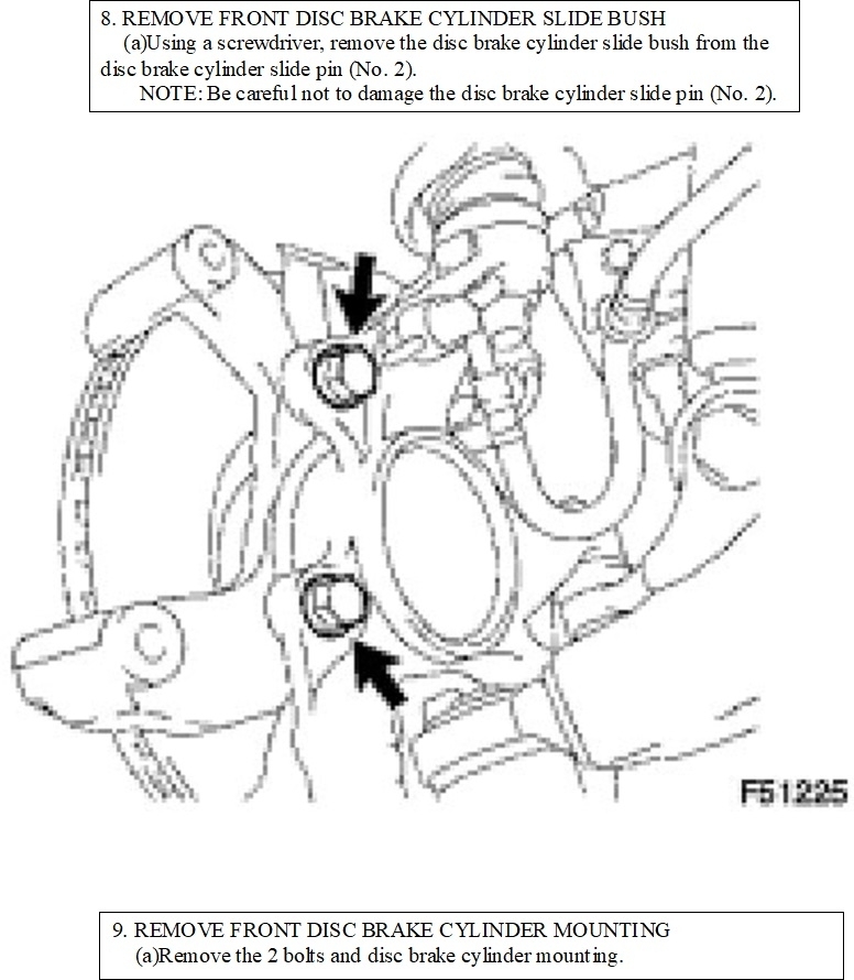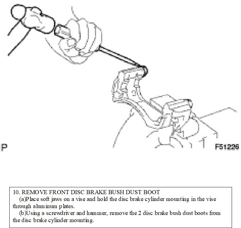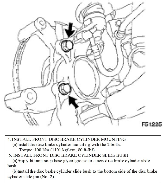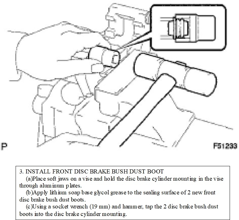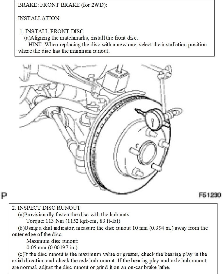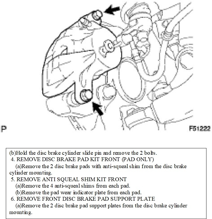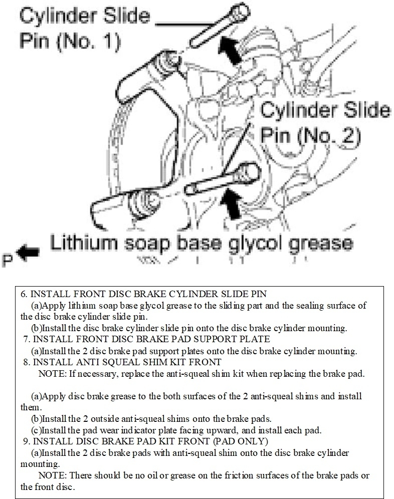 This is where slapping in a new set of pads differs a lot from a professional brake job. New pads can get you back on the road, and usually will not compromise safety, but it can impact customer satisfaction. First let me post the instructions from Toyota for the 2wd model. Read through that all the way first because there's a lot of information that is confusing. I'll elaborate on that next.