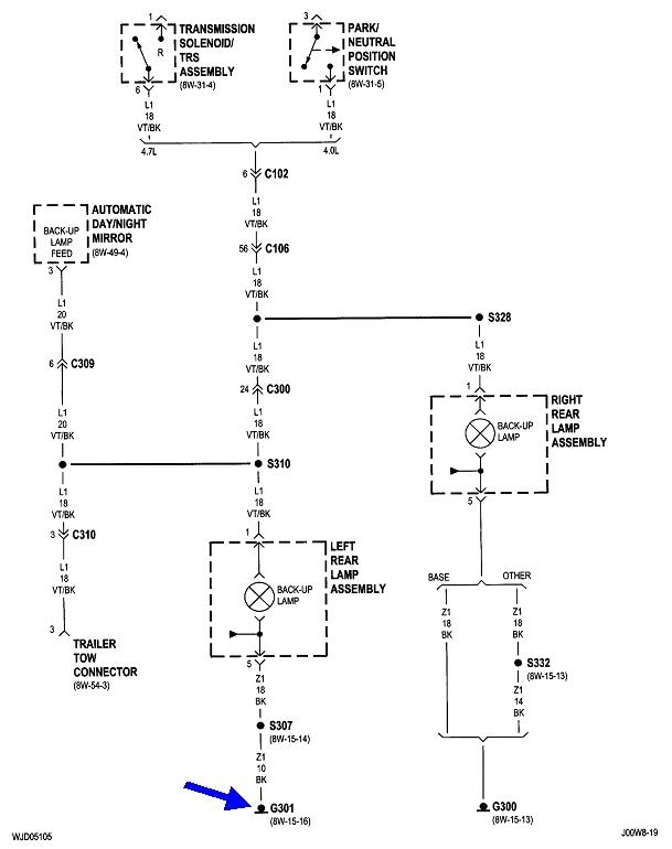 The additional clue is to observe which other lights don't work. From the diagrams, you'll see ground # G301 is shared by the left brake light, back-up light, tail light, and both license lamps. If all of those lights don't work properly, the best suspect is ground # G301, under the driver's seat. All those circuits come together at splice # S307. If some of those lights work, ground # G301 has to be okay, then the problem lies between splice # S307 and the inoperative light socket.