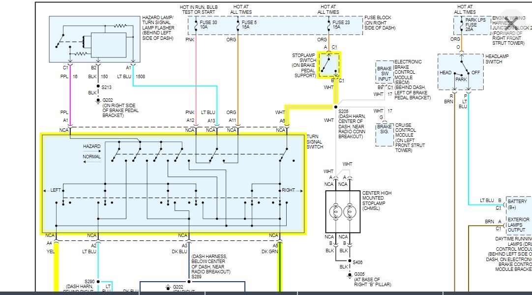 Third brake light works. Sockets when pressed come out to.314. Turn signals, and running lights work. Now, the headlights stay on except when ignition if off. I checked all bulbs, and pedal switch. Fuses all test great. I'm at a loss.