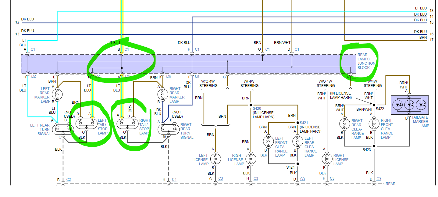 Next to the 1st diagram. If your rear turn signals work, it cant be a Ground problem because the Brake lights and turn signals, tail lights share a Ground back there (circled in green).