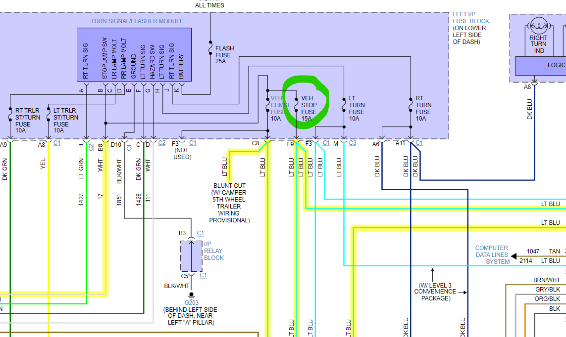 Starting with the 3rd diagram, you see the wire I labelled going to your cruise control unit. The test you can do, is run the truck and use your cruise control, the cruise control should turn off when you tap the brake pedal. If it doesnt that means the cruise control unit is probably not receiving a signal from the brake pedal switch and the issue is most likely in that Under Hood Fuse Block.