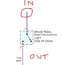 If power is present, it feeds to the violet/white wire when the switch is actuated, confirm the switch is properly adjusted and actuating the switch when the brake is applied.
